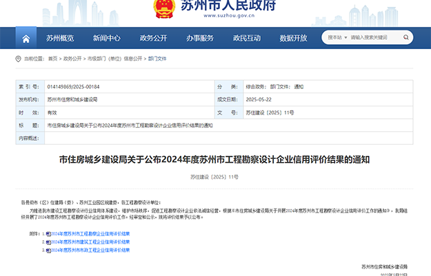 近日,蘇州市住房和城鄉建設局2024年度蘇州市工程勘察設計企業(yè)信用考評結果公布,據悉,本次多家工程勘察、建筑工程和市政工程企業(yè)參加綜合評定。